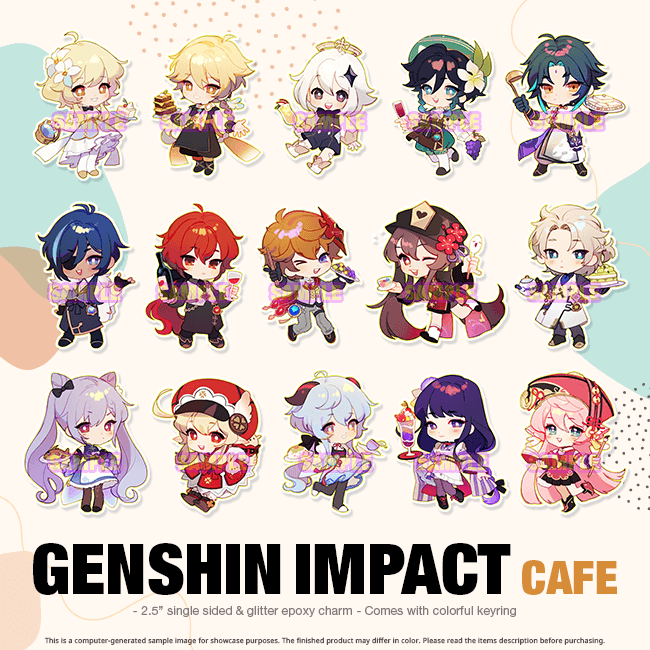 Single-sided epoxy charms featuring some of the Genshin Impact cast with the cutest cafeteria outfits!