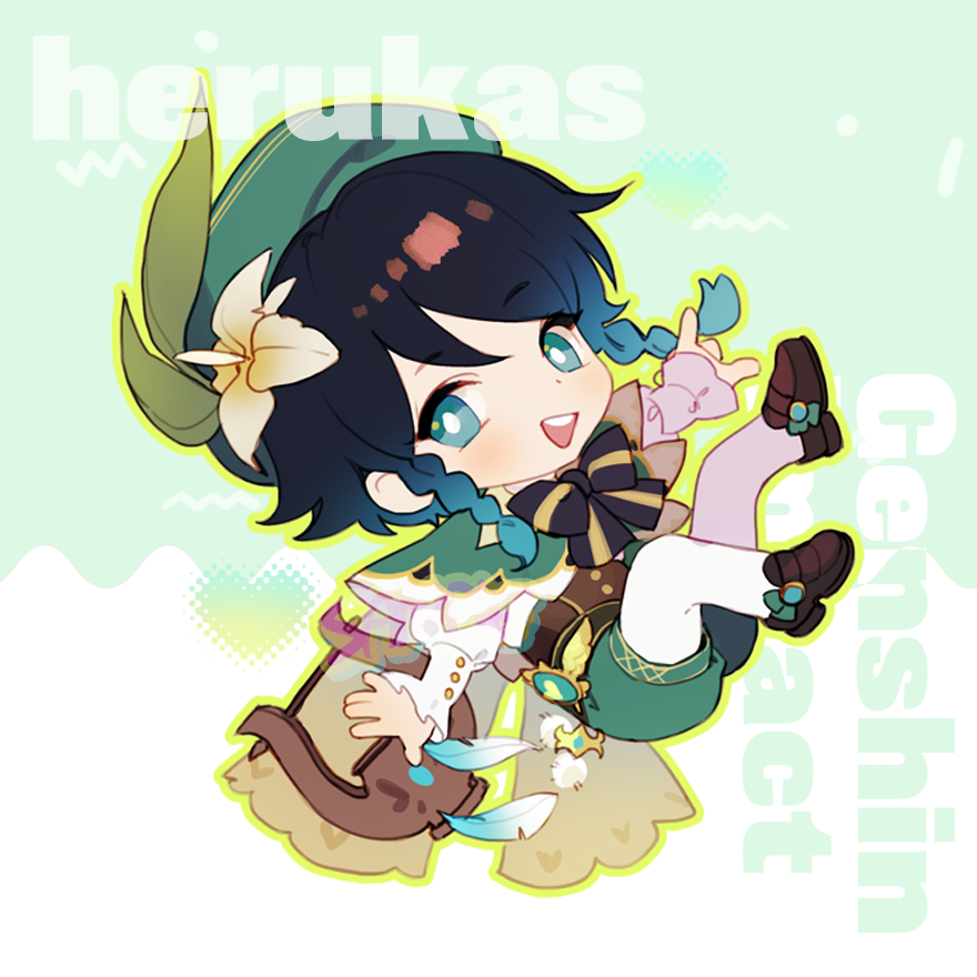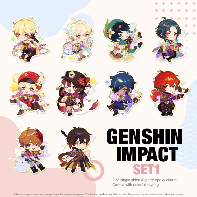 First set of single-sided epoxy charms featuring some of the characters from Genshin Impact.